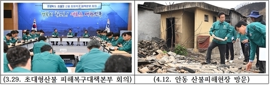 경상북도는 산불 진화 후 산불피해복구대책본부를 구성해 모든 행정력을 피해복구에 집중하는 한편, 지원범위 확대와 지원단가 현실화 등 실질적 지원과 피해지역을 혁신적으로 재창조하기 위한 특별법안을 마련했다.