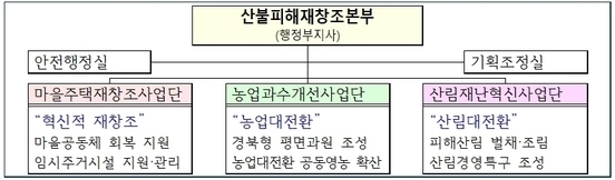 산불 피해복구는 산불피해재창조본부를 중심으로 원활하게 추진되고 있다. 5월 19일 출범한 산불피해재창조본부는 마을주택재창조사업단, 농업과수개선사업단, 산림재난혁신단의 3개 사업단으로 구성되어 마을, 농업, 산림 부문의 산불피해 복구를 전담하고 있다.