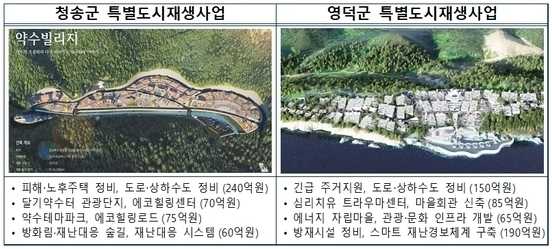 마을 전체가 불탄 24개 마을의 마을주택재창조사업은 실시설계 후 올해 연말 또는 내년 상반기 중 착공할 수 있을 전망이다. 특히, 국토부의 특별재생사업으로 시행되고 있는 영덕 노물리‧석리와 청송 달기약수터는 민간투자 유치를 통해 마을 그 자체로 관광지가 되는 명품마을을 만들어 간다는 계획이다.