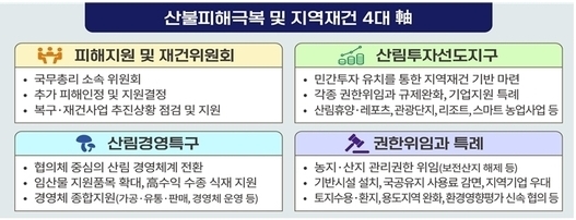 현 재난복구체계에서 제외된 다양한 피해들에 대한 추가 피해인정과 보상‧지원을 논의할 기구로 국무총리 소속의 피해지원 및 재건위원회가 구성된다. 각종 권한위임과 규제완화, 기업지원 등 특례를 통한 민간투자 유치로 신속한 피해복구와 혁신적 재창조 사업을 추진하기 위한 산림투자선도지구와 산림을 보존하되 경제적으로 활용하는 산림소득성장모델로서 산림경영특구가 반영됐다.