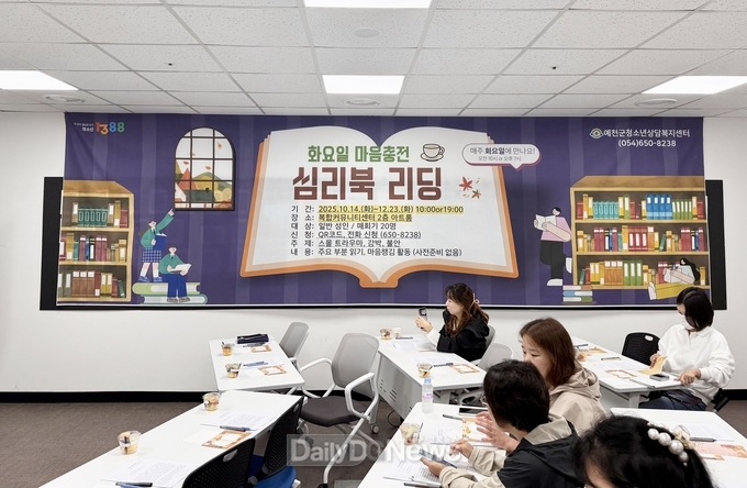 (데일리대구경북뉴스=황지현 기자)예천군(군수 김학동)은 ‘청소년안전망 Into 아웃리치’ 사업의 일환인 ‘화요일 마음충전 심리북리딩’ 프로그램을 지역 성인들을 대상으로 10월 14일부터 12월 16일까지 10주 동안, 매주 화요일 오전 10시와 오후 7시에 90분간 운영한다.