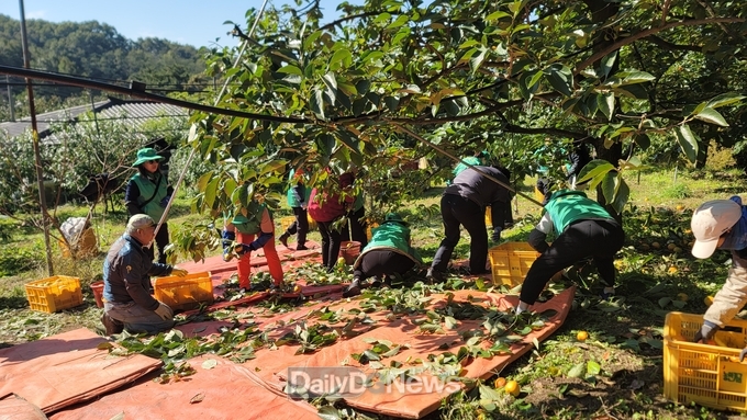 이날 외남면 소은리 일손부족 곶감 농가를 찾아 감 수확 봉사를 함께하며 구슬땀을 흘렸다.