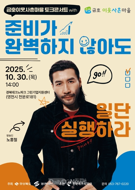 (데일리대구경북뉴스=김형만 기자)경상북도는 10월 30일 영천시 경북테크노파크 그린기업지원센터에서‘금호이웃사촌마을 창업가 토크콘서트 with 노홍철’을 청년창업가와 예비창업가 100여 명이 참석한 가운데 성황리에 개최했다.