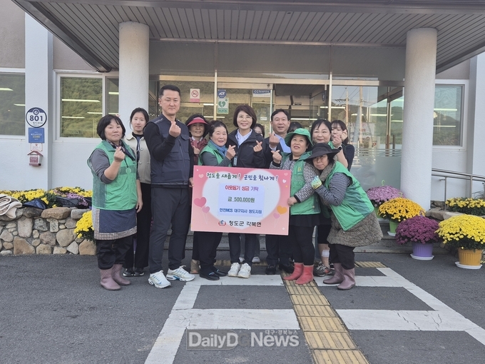 (데일리대구경북뉴스=황지현 기자)청도군(군수 김하수) 각북면은 11월일 4일 한전MCS 대구지사 청도지점에서 각북면 새마을부녀회를 통해 이웃돕기 성금 50만원을 기부를 했다고 밝혔다.