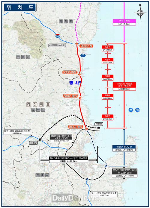 한편, 이번 포항~영덕 고속도로의 개통으로 국가간선도로망 남북10축(부산~포항~고성, 433㎞) 중 미연결 구간은 영일만 횡단(18㎞), 영덕~삼척(117.9㎞), 속초~고성(43.5㎞)만 남았다.