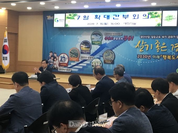경산시는 7월 15일 오후 대회의실에서 최영조 시장 주재로 부시장, 국·소장, 담당관·단·과·소장 및 읍면동장 등 직원 60여 명이 참석한 가운데 7월 확대간부회의를 개최했다고 밝혔다.