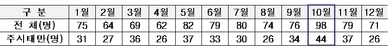 한편, 최근 5년간(‘18년~‘22년) 고속도로 사망자 통계에 따르면 전방 주시태만에 의한 교통사고 사망자 비율*은 지속적으로 증가하고 있으며, 행락철인 10월의 경우 교통량 증가와 유지보수 공사 등 교통안전 여건 악화로 1년 중 주시태만에 의한 교통사고 사망자가 가장 많이 발생하는 시기로 나타났다.( * (사망자비율) ‘18년 34% → ‘22년 50.0%)