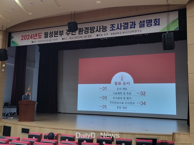 (데일리대구경북뉴스=황지현 기자)경북대 방사선과학연구소(소장 이세욱 교수)는 5월 3일 오후 ‘2023년도 월성 본부 주변 환경방사능 조사설명회’를 지역주민들이 참석한 가운데 경주시 양남면소재 월성스포츠센터 2층 강당에서 개최했다.