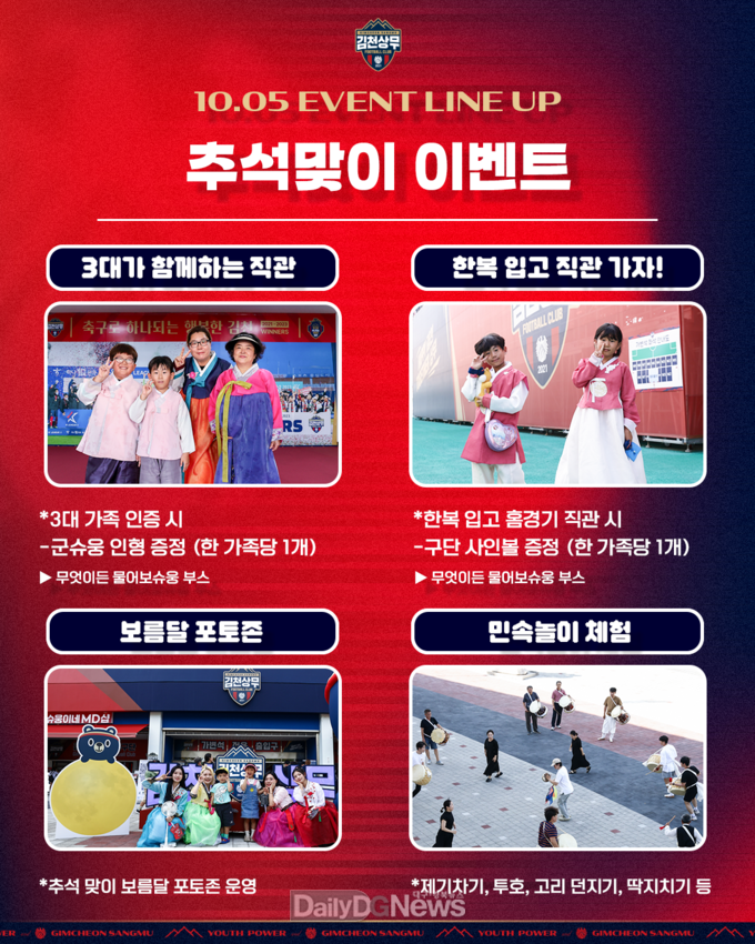 한가위를 맞아 김천시체육회(회장 최한동)는 단체관람 초청으로 지역사회 스포츠 복지 발전에 앞장선다. 지난 FC서울전, 수원FC전, 포항전에 이어 울산전에도 단체관람을 지원한다. 하프타임에는 김천 출신 밴드 ‘잭킹콩’의 특별 공연이 예정되어 있다. 경기 종료 후에는 9기 선수가 직접 뽑는 특별경품 추첨 이벤트가 있다. 경품은 100만 원 상당의 김치냉장고 2대로 가족과 함께 하는 한가위에 풍성함 더한다.
