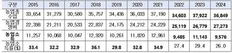 농식품부와 통계청 자료에 따르면 농가의 소득구조가 악화되고 있다. 지난 10년간 농업소득률은 2015년 33.4%에서 2024년 26%로 7.4%P 크게 하락했다. 농업총수입과 농업경영비는 증가하는 추세이나 농업소득은 감소하면서 농업소득은 2022년을 제외하고 가장 낮았고 농업소득률은 역대 최저치를 기록했다.