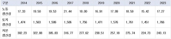 더 큰 문제는 농업 투자의 효율성이 갈수록 악화되고 있다는 점이다. 농업의 3대 생산요소인 노동, 토지, 자본의 생산성 변화를 분석한 결과, ‘자본생산성’의 추락이 유독 두드러졌다.