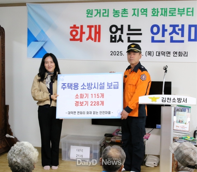송영환 김천소방서장은 “KT&G 김천공장의 적극적인 지원 덕분에 소방 안전 사각지대에 놓일 수 있는 마을에 소방시설을 보급하고 안전문화를 확산할 수 있게 되어 매우 뜻깊다”며, “앞으로도 지역사회 유관기관과의 협력을 강화해 시민 모두가 안심하고 살 수 있는 안전한 김천을 만드는 데 최선을 다하겠다”고 말했다.