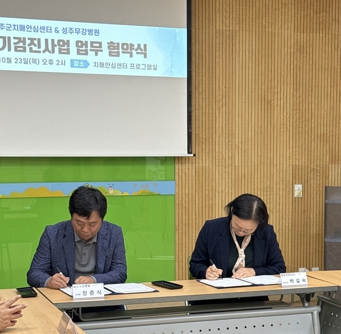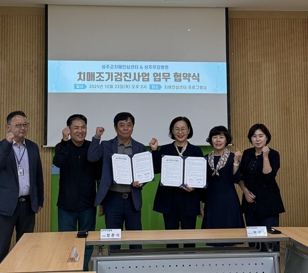 (데일리대구경북뉴스=신명곤 기자)성주군치매안심센터(센터장 박길숙)는 성주무강병원(이사장 정준식)과 10월 23일 성주군보건소에서 지역사회 치매예방과 조기발견을 위한 상호 협력체계를 강화하기 위해 치매조기검진사업 업무협약을 체결했다.