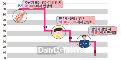 첫 감염이 이루어지는 연령에 따라 만성화가 되는 비율이 눈에 띄게 달라진다. 특히 주산기 또는 영아기 감염 시 약 90%에서 만성화가 되기 때문에 임신부의 경우 B형간염 항체 검사를 통해 간염 여부 확인이 필수적이다. 따라서, 임신 중 B형간염 고위험군의 경우 산부인과 전문의와 상담 후 접종 여부를 결정해야 한다.