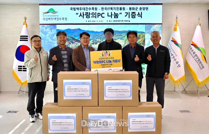 (데일리대구경북뉴스=황지현 기자)산림청 산하 한국수목원정원관리원(이사장 심상택)은 11월 5일 국립백두대간수목원 산림환경연구동에서 ‘사랑의PC 나눔 기증식’을 열고 춘양면 지역 내 정보소외계층에게 재생산PC 5세트를 전달했다.