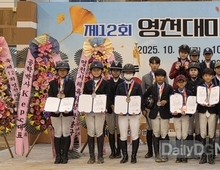 (데일리대구경북뉴스=양승미 기자)=영천시는 지난 17일부터 19일까지 말산업특구도시인 영천시의 운주산 승마조련센터에서 개최된 ‘제12회 영천대마기 전국승마대회’가 성황리에 마무리됐다고 밝혔다. 영천시승마협회에서 주최·주관하고 올해로 12회를 맞은 이번 대회에는 전국에서 200여 명의 선수와 150여 필의 마필이 참가했다. 화창한 가을 날씨 속에 1,000여 명의 관람객이 현장을 찾아, 대회는 활기찬 분위기 속에 진행됐다. 대회 결과, 첫날 경기에서는 ▲마장마술 D-Class(유소년) 초등부 백지윤(남광초), 중등부 김가림(양산중앙중) ▲마장마술 D-Class(국산마) 고대일반부 윤은수(신경주대) ▲장애물 95-Class(유소년) 초등부 정우성(옥곡초), 중등부 고아영(포항동해중) ▲장애물 100-Class(국산마) 유소년부 김도연(기계초), 고대일반부 이승훈(성운대) ▲권승경기(유소년) 초등부 주은율(제산초), 중등부 여민석(동도중) ▲KHIS-7 통합부 백정원(탐라중) 선수가 1위를 차지했다. 2일차 경기에서는 ▲장애물 40-Class(유소년) 초등부 문채원(한라초), 중등부 김희은(회인중) ▲장애물 50-Class(국산마) 유소년부 김사랑(대원초), 고대