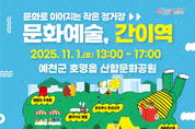 (데일리대구경북뉴스=황지현 기자)(재)예천문화관광재단(이사장 김학동 예천군수)은 11월 1일 예천군 호명읍 산합문화공원(걷고싶은 거리)에서 ‘문화예술, 간이역’ 10월 프로그램을 개최할 예정이다. ‘문화예술, 간이역’은 문화체육관광부와 지역문화진흥원이 주관하고, (재)예천문화관광재단이 주최하는 ‘2025 문화가 있는 날 구석구석 문화배달’ 사업의 일환으로, 일상 속에서 문화를 자연스럽게 접하고 다양한 문화 향유 기회를 누릴 수 있도록 기획된 지역 밀착형 프로그램이다. 이번 프로그램은 9월에 이어 두 번째로 진행되는 야외형 문화행사로, 단풍으로 물드는 가을 정취 속에서 다채로운 공연과 체험이 어우러진 프로그램으로 구성됐다. 주요 프로그램으로는 싱어송라이터 ‘어치브’와 ‘퓨전국악 이어랑’이 함께하는 청춘콘서트, 가족 단위 관객을 위한 마술과 버블쇼, 환경문제 인식을 높이는 체험형 콘텐츠 ‘리사이클 정류장’, 감성을 자극하는 독서 프로그램 ‘북적북적 북크닉’이 준비된다. 특히 이번 북크닉에서는 예천 출신의 그림작가 송태고 작가와 함께하는 북 토크 콘서트와 클레이 체험 프로그램도 함께 진행되어 지역 예술가와의 교류를 통해 문화적 의미를 더할 예정이다. 또한 추억을