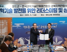 (데일리대구경북뉴스=황지현 기자)청도군(군수 김하수)과 한국과학기술단체총연합회 경북지역연합회(회장 서상곤)는 11월 7일 청도군청 제1회의실에서 청도군 간부공무원과 경북지역연합회 임원 등 30여 명이 참석한 가운데 ‘경북 과학기술 발전을 위한 리더스미팅’을 개최했다. 회의에서는 ‘청도군 과학기술정책 추진 방향’을 주제로 발표와 토론이 이뤄졌고, 고령친화 스마트 헬스케어, 농축산 분야 탄소저감(스마트팜·재생에너지), 디지털 안전망 구축 등 지역 현안에 대해 실증 중심의 협력 방안을 집중 논의했다. 이어 상호협력 업무협약(MOU)을 체결하고, 정책–현장 연계를 강화해 가시적 성과를 내기로 합의했다. 주요 협약 사항은 ▲지역 과학기술 발전을 위한 교류활동 및 공동연구 개발 ▲지역 산업 발전을 위한 전문인력·정보 교류 ▲미래 과학인재 육성을 위한 과학문화 사업 추진 협력 ▲상호발전을 위한 인적 교류 등이다. 김하수 청도군수는 “현장의 문제를 과학기술로 풀어내는 데 집중하겠으며 이번 협약을 계기로 청도형 스마트 안전·헬스케어, 농축산 탄소저감 같은 실질 과제를 속도감 있게 추진해 군민이 체감하는 변화를 만들겠다”고 밝혔다. 청도군은 이번 협력을 통해 군민이 체감하는