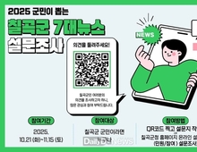 (데일리대구경북뉴스=황지현 기자)칠곡군은 올 한 해 군정 주요 이슈 중 군민들의 관심이 컸던 ‘2025년 7대 뉴스’를 선정하기 위한 설문조사를 10월 21일부터 11월 15일까지 실시한다. 이번 설문조사는 칠곡군청 홈페이지 ‘설문조사’ 메뉴를 통해 진행되며, 군정에 관심 있는 군민 누구나 참여할 수 있다. 설문 대상은 언론에 집중 보도되었거나 화제가 된 17개 뉴스 항목이며, 이번에 선정된 7대 뉴스는 군 홈페이지를 통해 12월 중 발표될 예정이다. 7대 뉴스 후보로는 △럭키칠곡 상표등록 △거점 복지전담센터 개소 △왜관 홀리 페스티벌 개최 △칠곡 꿀맥 페스티벌 개최 △AI와 접목한 칠곡낙동강평화축제 △칠곡군 청년센터 개소 △칠곡사랑상품권 할인율 13% △어르신 대중교통 무임 교통카드 발급 △행복택시 확대 운영 △파크골프장 직영 체제 전환 △낙동강 수변공원 기본계획 수립 △내륙 칠곡에서 흰다리새우 양식 성공 △율리~오평간 연결도로 개설 △아파트 외벽 대형 벽화 조성 △60세 이상 대상포진 예방접종 지원 △칠곡군 프리미엄 쌀 재배 단지 조성 △평생학습도시 재지정이 있다.