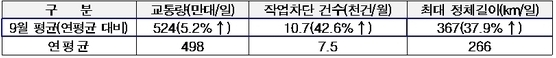 9월은 나들이 이동수요 증가와 동절기 대비 고속도로 집중정비로 인해 교통량(524만대/일)·작업차단 건수(10.7천건/월)는 연중 최대이며 고속도로 정체 구간이 가장 길어지는 시기이므로, 이로 인한 추돌 사고에 각별히 주의해야 한다.