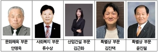(데일리대구경북뉴스=황지현 기자)경산시(시장 조현일)는‘2025년도 경산시민상 심의위원회’를 열어 문화체육 부문 안명욱, 사회복지 부문 류수상, 산업건설 부문 김근화, 특별상에 김진택, 윤진필 씨를 경산시민상 수상자로 선정했다.