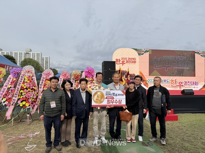 (데일리대구경북뉴스=황지현 기자)예천군(군수 김학동)은 10월 21일, 영주시 문정둔치에서 열린 ‘2025년 경상북도 한우경진대회’에서 예천군 풍양면 김영휘 씨가 암송아지 부문 최우수상을 수상해 예천한우의 우수성을 널리 알렸다.