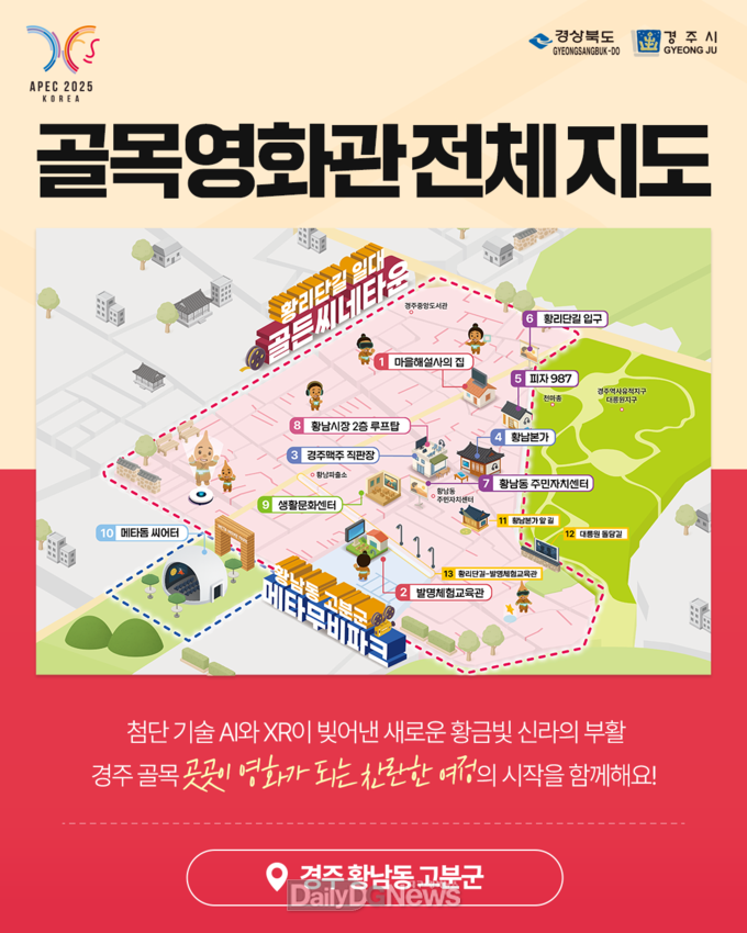 (데일리대구경북뉴스=김형만 기자)경상북도는 10월 29일부터 11월 2일까지 5일간 경주 황리단길 일원에서 ‘에이아이(AI)‧엑스알(XR) 골목영화관’을 운영한다.