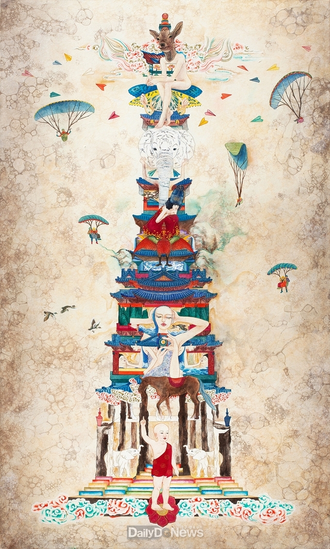 △오선아 작가는 전통을 존중하되 오늘의 언어로 다시 그려내며 전통 불교회화의 정신을 근간으로 한 현재의 지금, 여기, 일상을 기록한다.