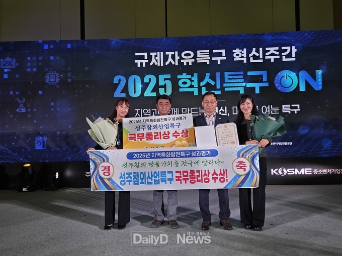 (데일리대구경북뉴스=신명곤 기자)성주군은 중소벤처기업부에서 실시한 2025년(2024년 실적) 지역특구 운영성과 평가에서 성주참외산업특구가 ‘우수특구’로 선정되어 ‘국무총리상’을 수상했다.