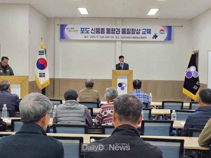 (데일리대구경북뉴스=황지현 기자)김천시는 11월 7일 김천시포도수출유통영농조합법인에서 김천포도 농가를 대상으로 ‘포도 신품종 동향과 포도산업 대응전략’을 주제로 교육을 실시했다.