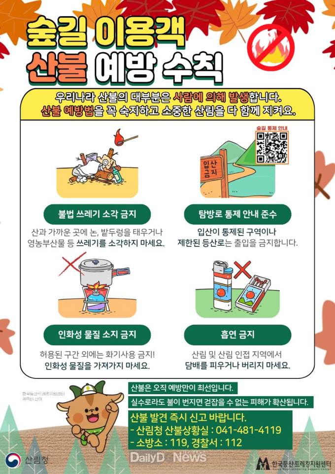 (데일리대구경북뉴스=황지현 기자)산림청 산하 공공기관인 한국등산‧트레킹지원센터(이사장 서경덕)는 가을철 산불조심기간(10월 20일∼12월 15일)을 맞아 11월 8일 국가숲길과 동서트레일 일대에서 산불예방 합동 캠페인을 실시했다.