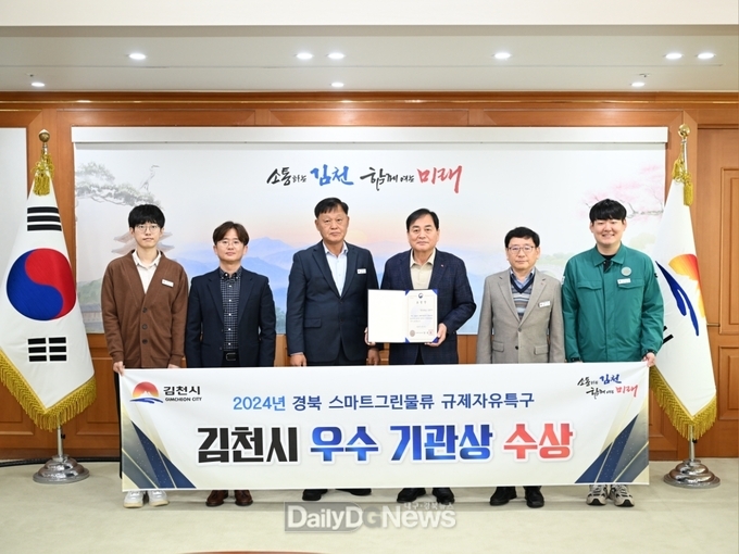 (데일리대구경북뉴스=황지현 기자)김천시(시장 배낙호)는 11월 6일 대전에서 이틀간 열린 중기부 주최 ‘혁신특구 ON 2025’ 행사에서 스마트그린물류 규제자유특구 운영 성과를 인정받아 우수기관상을 수상했다.