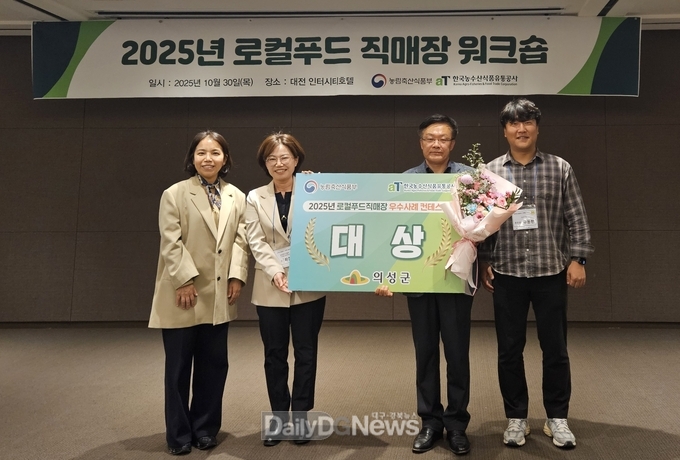 (데일리대구경북뉴스=김형만 기자)의성군(군수 김주수)은 지난 10월 30일 ‘의성로컬푸드직매장’이 농림축산식품부와 한국농수산식품유통공사(aT)가 공동 주관한 ‘2025년 로컬푸드직매장 우수사례 공모전’에서 대상을 수상했다.