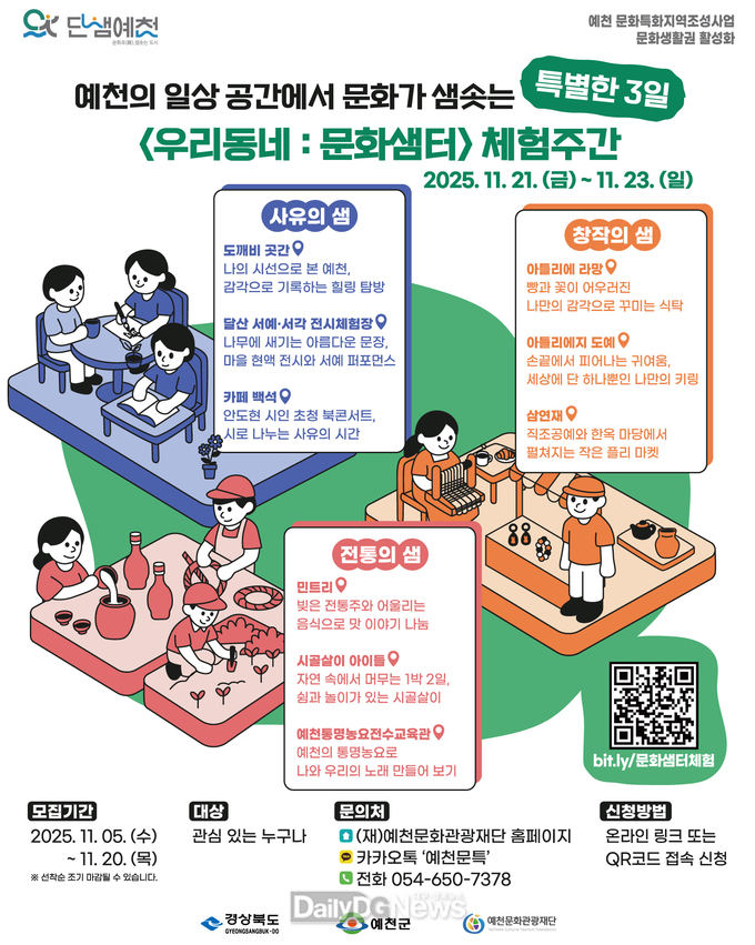 (데일리대구경북뉴스=황지현 기자)예천군과 예천문화관광재단(이사장 김학동 예천군수)은 ‘문화특화지역 조성사업’의 일환으로 11월 20일까지 예천의 9개 문화공간을 체험할 수 있는 ‘우리동네: 문화샘터 체험주간’ 참여자를 모집한다.
