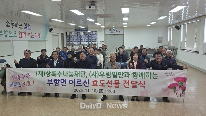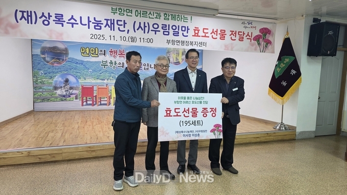 (데일리대구경북뉴스=황지현 기자)(재)상록수나눔재단·(사)우림일만(이사장 이상춘)이 11월 10일, 부항면 행정복지센터에서 부항면 관내 80세 이상 어르신 세대를 대상으로 수산물로 구성된 ‘효도 선물 전달식’을 개최했다.
