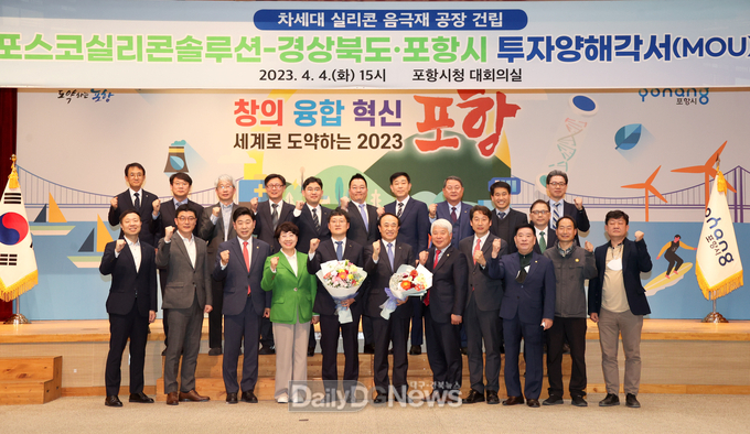 경상북도와 포항시는 4월 4일 포항시청 대회의실에서 이달희 경북도 경제부지사, 김남일 포항부시장, 유병옥 포스코홀딩스 부사장, 이재우 포스코실리콘솔루션 대표이사, 박용선 경북도의회 부의장, 백인규 포항시의회 의장을 비롯해 김상우 포스텍 산학협력단장, 김종록 한동대 행정부총장, 김형락 포항대 총장, 강흥식 가속기연구소 소장, 이점식 포항TP원장 등 산학연 관계자 30여명이 참석한 가운데 포스코실리콘솔루션과 3000억원의 대규모 투자협약을 체결했다.