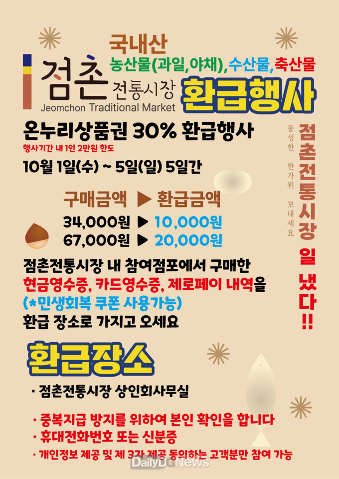 또한, 10월 1일부터 5일까지 ‘농‧축/수산물 온누리상품권 환급행사’가 있다. 참여점포에서 국내산 농‧축‧수산물 구매영수증을 가지고 오면 △구매금액 34,000원이상 10,000원 △구매금액 67,000원이상 20,000원을 온누리상품권으로 돌려준다.