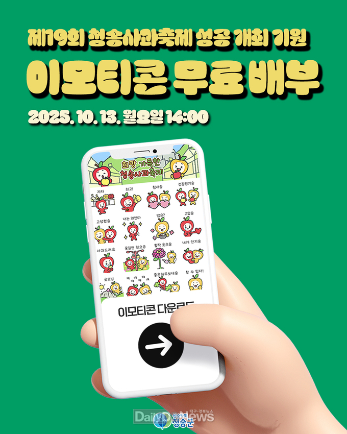 (데일리대구경북뉴스=양승미 기자)=청송군(군수 윤경희)은 오는 10월 29일 개막하는 제19회 청송사과축제를 앞두고, 청송 사과 캐릭터 ‘청이와 송이’를 활용한 특별 이모티콘 16종을 10월 13일 오후 2시부터 무료 배포한다고 밝혔다.