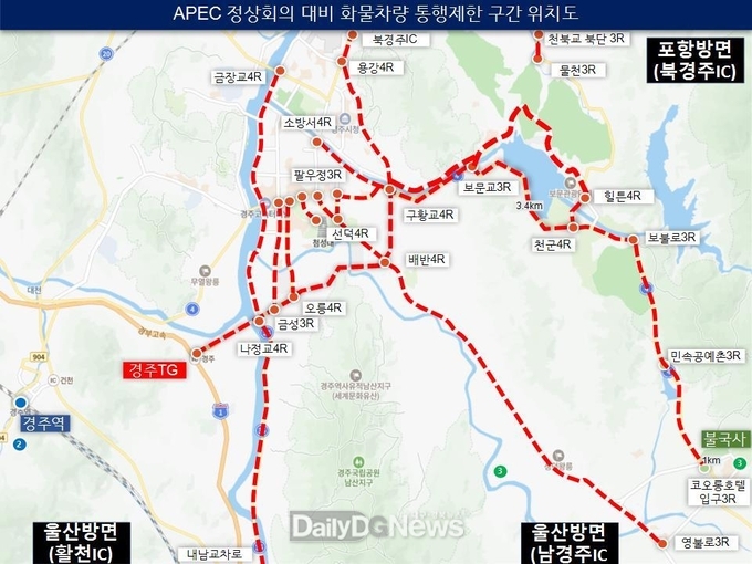 특히 포항방면(북경주IC~용강네거리), 울산방면(남경주IC~배반네거리), (내남교차로~나정교사거리) 등 경주를 남북으로 관통하는 주요 도로의 경우 2.5t 이상 화물차량과 건설기계(덤프트럭, 도로보수트럭 등) 등 총 중량 10t 이상 특수차량의 통행이 전면 금지되므로 운전자의 주의가 요구된다.