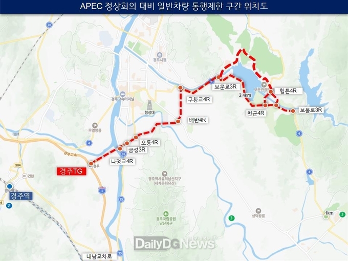이에 따라, 경주TG ~ 배반네거리 ~ 구황교네거리 ~ 보문교삼거리 ~ 보문단지로 연결되는 서라벌대로·산업로·경감로·보문로 등 행사에 이용될 주요 도로구간은 참가국 정상 차량 이동 등 행사차량으로 인해 일시적으로 일반차량의 통행이 제한된다.