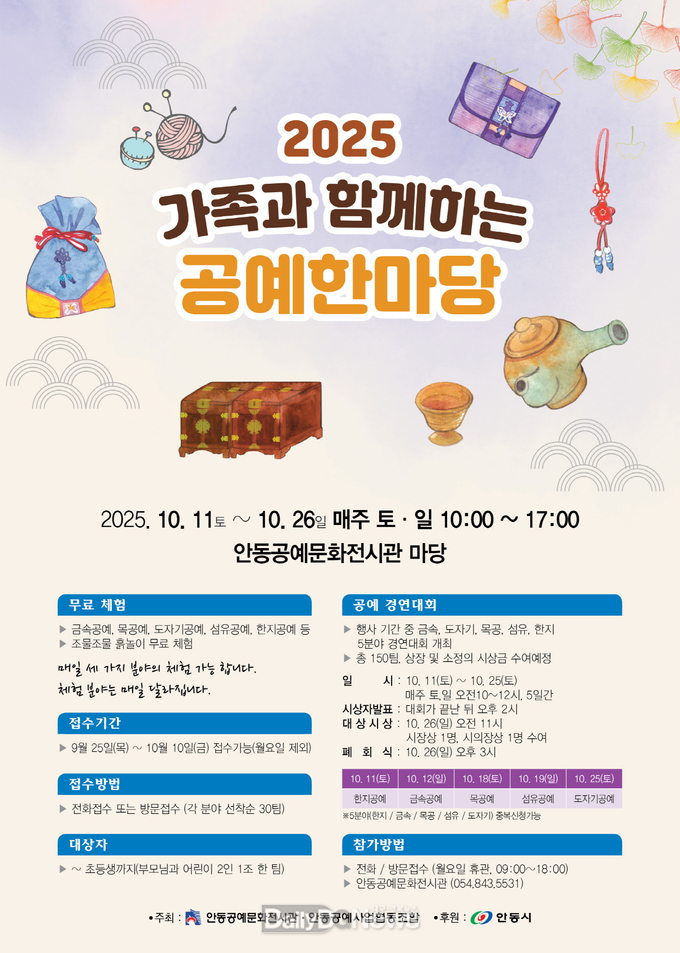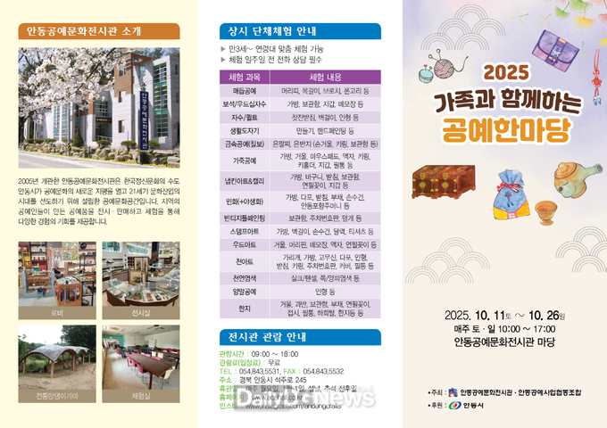 (데일리대구경북뉴스=황지현 기자)안동공예문화전시관이 주최하고 안동시가 후원하는 ‘2025 가족과 함께하는 공예한마당’ 행사가 한창 준비되고 있다.