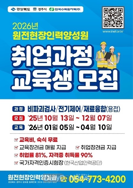 (데일리대구경북뉴스=황지현 기자)원전 및 전력산업 현장기술인력 양성을 위해 설립된 (재)원전현장인력양성원(원장 이인식, 이하 양성원)은 10월 13일부터 12월 7일까지 2026년 제15기 취업과정 교육생을 모집 ‧ 선발하고 있다.