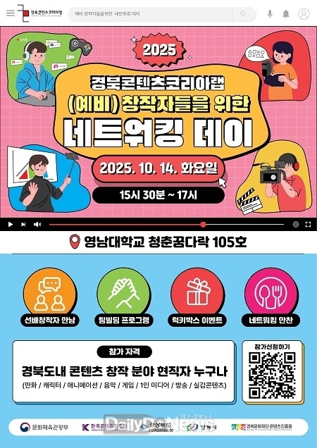 (데일리대구경북뉴스=황지현 기자)경북문화재단 콘텐츠진흥원(이하 진흥원)은 10월 14일 영남대학교 청춘꿈다락에서 경북 지역 창작자와 예비 창작자의 교류와 협업을 위한 ‘네트워킹 데이’를 개최할 예정이다.