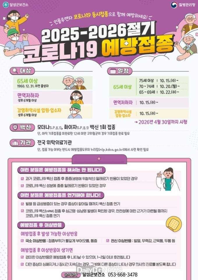 (데일리대구경북뉴스=이준호 기자) 대구 달성군(군수 최재훈)은 오는 10월 15일부터 2026년 4월 30일까지 ‘2025-2026절기 코로나19 예방접종’을 실시한다고 밝혔다.