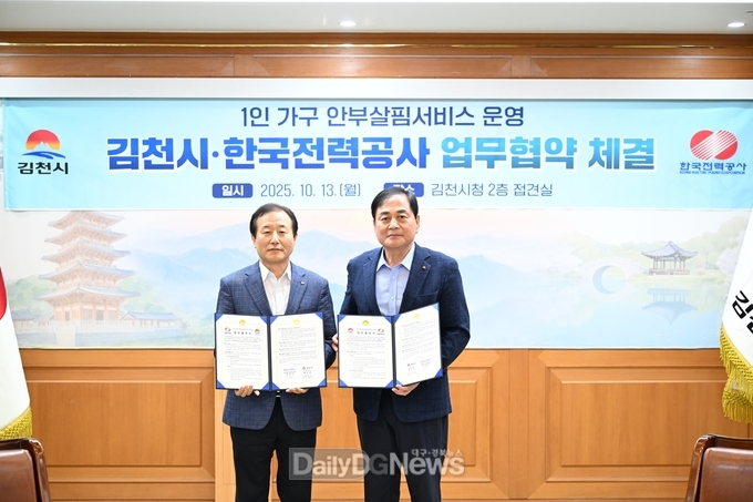 (데일리대구경북뉴스=황지현 기자)김천시(시장 배낙호)는 10월 13일 한국전력공사 대구본부 김천지사(지사장 박용성)와 함께 ‘1인 가구 안부살핌서비스 ‘든든e살핌’ 업무협약을 체결했다.