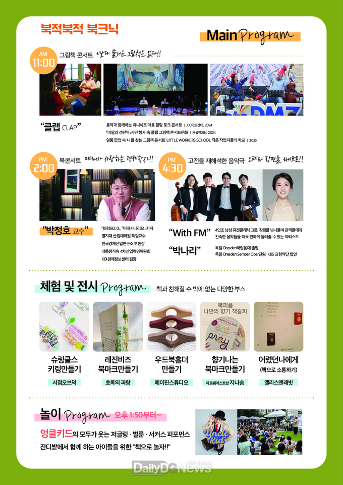 주요 프로그램은 연호공원 빈백쇼파에 앉아 책을 보는 자율독서 시간을 비롯해, 클랩스튜디오 라이브 연주팀이 함께하는 그림책 공연,‘4차 산업혁명에서 더 책이 필요한 이유’라는 주제로 진행될 박정호 교수의 북콘서트, 동화⋅소설의 장면을 음악과 함께 재구성한 피날레 음악극으로 구성해 방문객들에게 책과 음악, 문화가 어우러진 다채로운 경험과 독서의 매력을 느끼는 시간을 만들어 줄 것으로 기대된다.