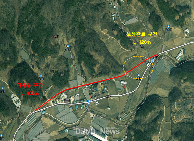 (데일리대구경북뉴스=황지현 기자)상주시는 10여 년간 미개통(0.8km) 상태였던 군도 20호선 화동면 어산리 우회도로 미개통 구간에 대해 토지 보상 절차가 마무리됨에 따라 공사를 재개하게 된다.