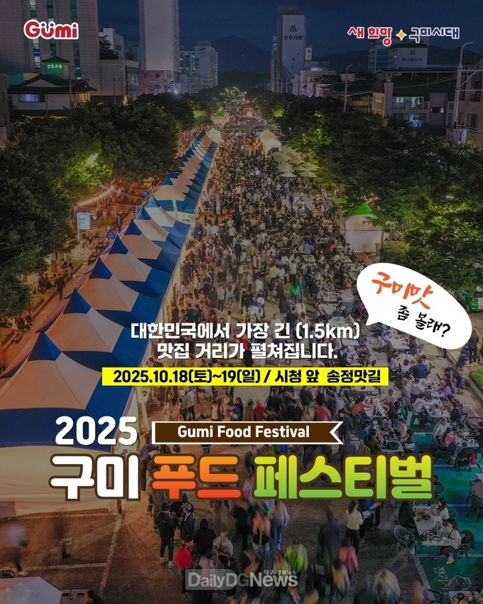 (데일리대구경북뉴스=황지현 기자)‘2025 구미푸드페스티벌’이 10월 18일부터 19일까지 이틀간, 시청 앞 송정맛길에서 열려 가을의 정취 속에서 구미가 다시 한 번 맛으로 뜨겁게 달아오른다.