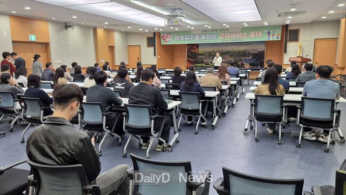 (데일리대구경북뉴스=황지현 기자)안동시는 10월 14일 웅부관 청백실에서 안동시 공무원 200여 명을 대상으로 민원응대 역량을 강화하고 원활한 민원서비스를 제공하기 위한 친절 교육을 실시했다.