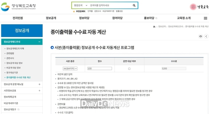 (데일리대구경북뉴스=황지현 기자)경북교육청(교육감 임종식)은 전국 최초로 ‘정보공개 사본 수수료 자동 계산 프로그램’을 자체 개발해 본청과 교육지원청, 직속기관 누리집에 구축을 완료했다.